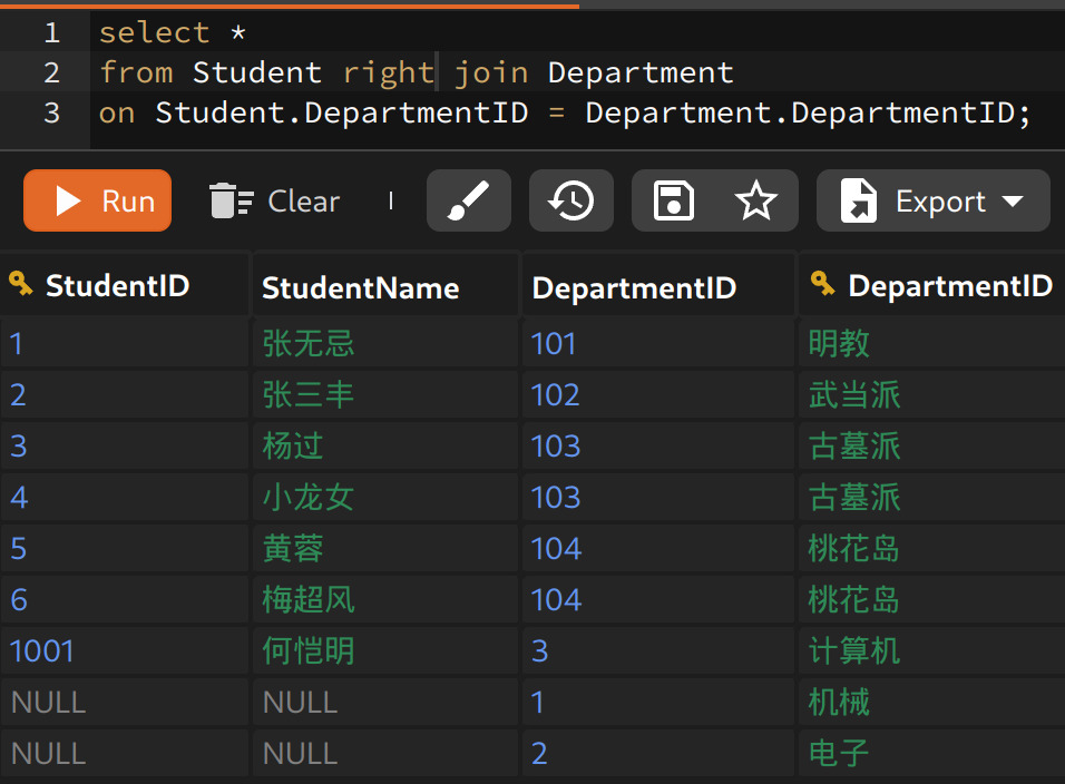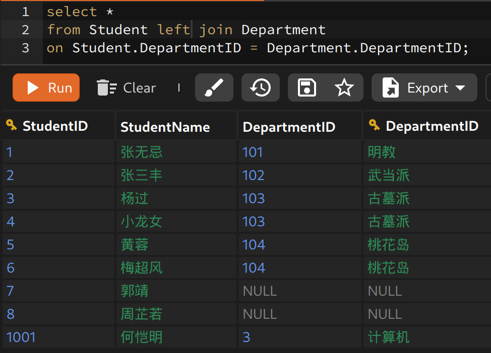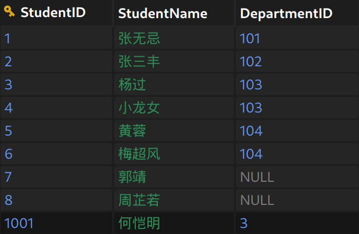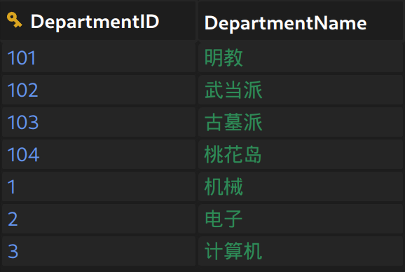 郭靖和周芷若由于DepartmentID为空,所以不在检索结果里
