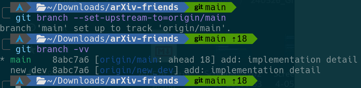 但由于我们是从默认分支(new_dev)的目前最新的commit为起点创建的本地main分支,那就领先了origin/main 18个commit了